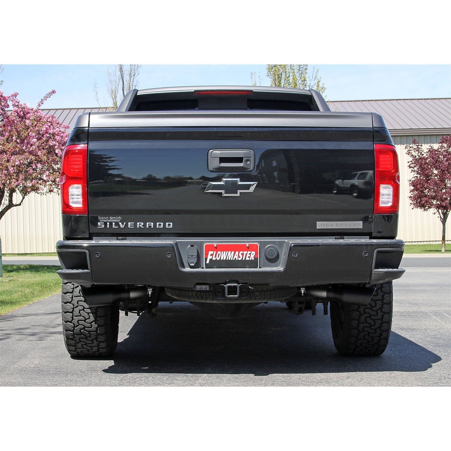 This Flowmaster[R] FlowFX[R] cat-back exhaust system for the 2011-2018 GM 1500 trucks with the 6.2 liter V8 engine is manufactured using durable 409 stainless steel throughout and features single 3.50 in. to dual 2.50 in. mandrel bent pipes for better exhaust gas flow, and a FlowFX straight-through muffler is used for a moderate sound level and maximum performance. Maximum increases on the dyno revealed plus 11 hp and plus 15 lb-ft at the rear wheels. This system exits out both sides, behind the rear wheels with 4.50 in. black ceramic tips for added style and a custom look. The system uses all the existing factory hanger locations and includes installation instructions and all necessary hardware for an easy installation that you can do at home. Backed by Flowmaster's Lifetime Limited Warranty.