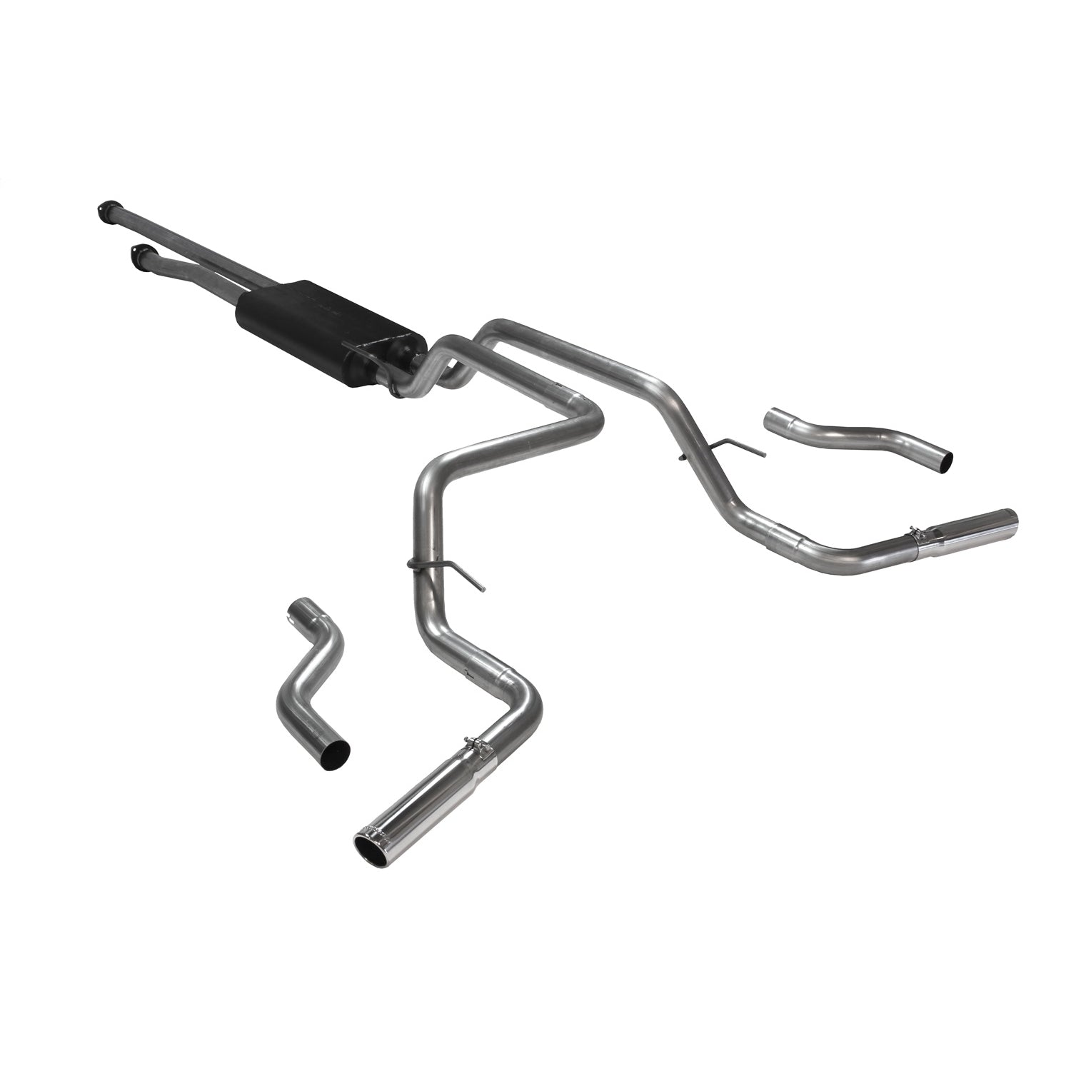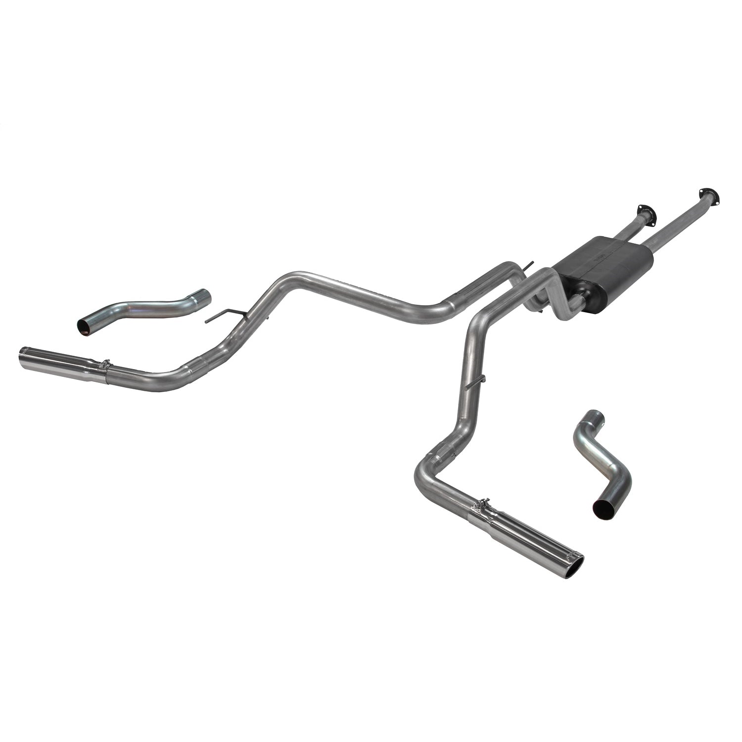 The Flowmaster Force II Cat-back exhaust system fits 2009-2021 Toyota Tundra trucks with the 4.6L, 4.7L or 5.7L engine and regular cab/long bed, double cab/short bed and CrewMax configurations. Manufactured using durable 409S stainless steel, the kit features a flanged dual inlet with mandrel-bent 2.50-inch stainless steel tubing running back into a 50-Series Big Block performance muffler, exiting into dual 2.50-inch tailpipes. Includes both side and rear exit tailpipes in the kit, so you can choose the desired look for your truck, and the tailpipes are finished off with 3.00-inch polished 304 stainless steel tips embossed with the Flowmaster name. As a Force II system it provides improved horsepower and torque, along with a moderate performance sound level both inside and outside the truck. Instructions and all the necessary hardware are included with the kit for an easy bolt-on installation and is covered by our Lifetime Limited Warranty. Note: Does NOT fit regular cab/short bed or double cab long bed configurations and Only fits models built after 08/01/2008.